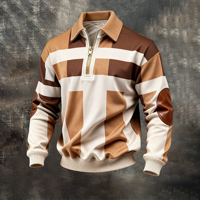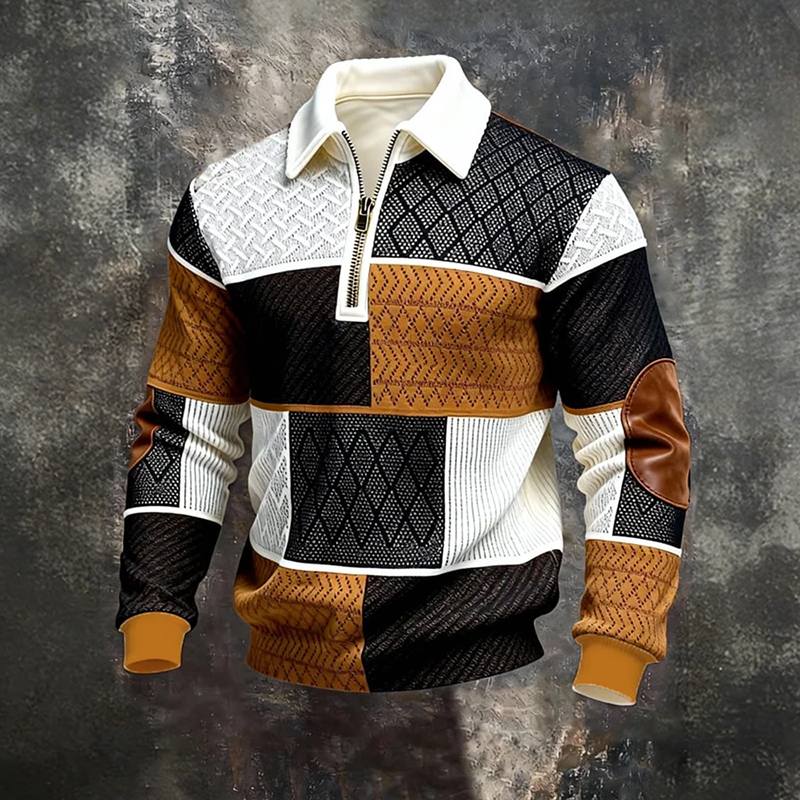 Men's Retro Color Block Print Zipper Sweatshirt