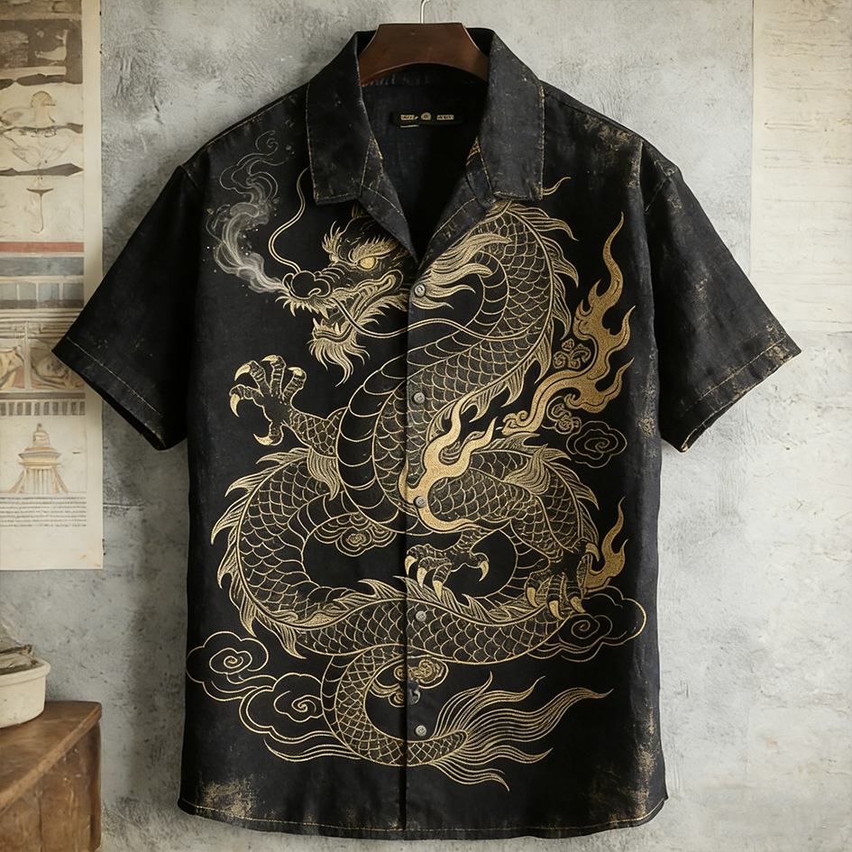 Japanese Art Retro Dragon Pattern Short Sleeve Shirt