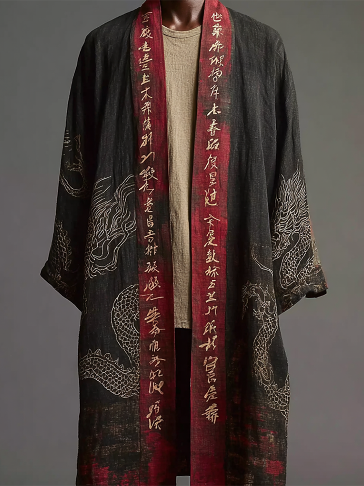 Men's Japanese Dragon Pattern Calligraphy And Painting Art Linen Long Kimono
