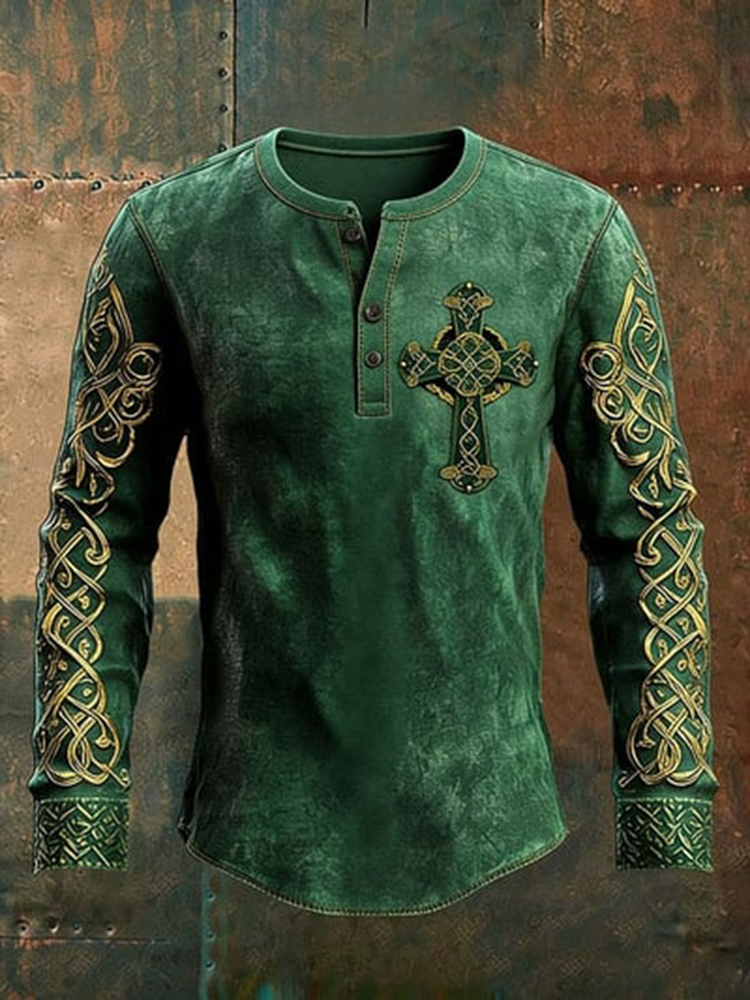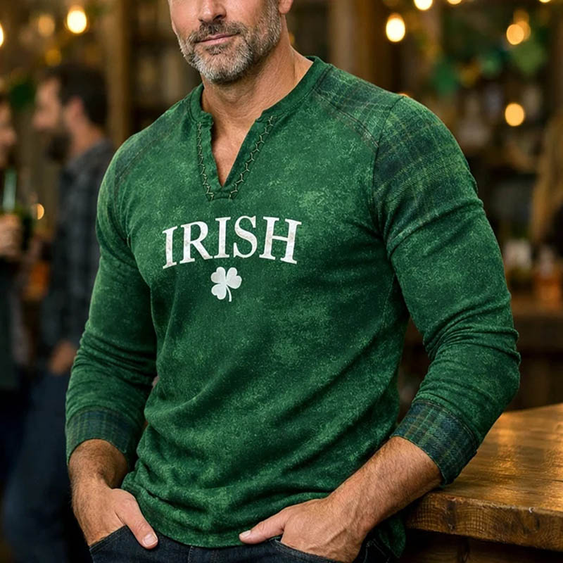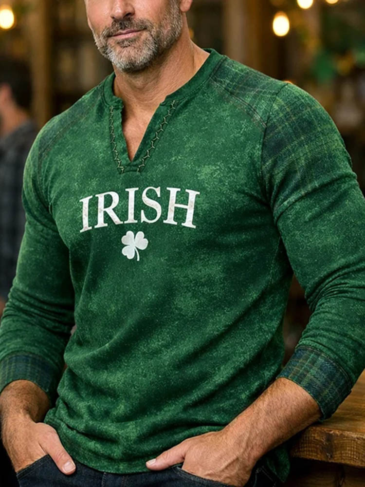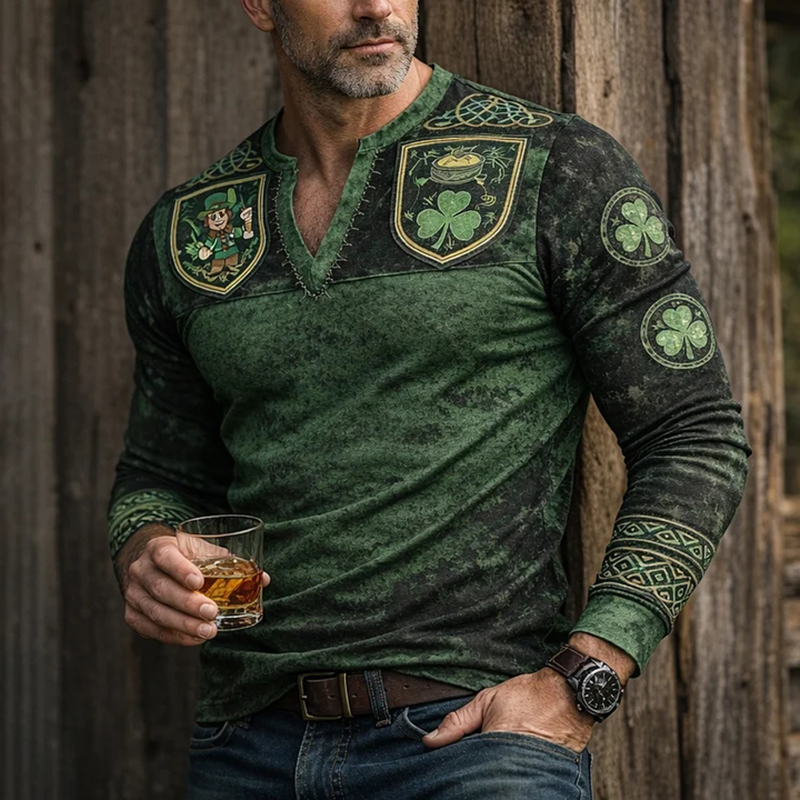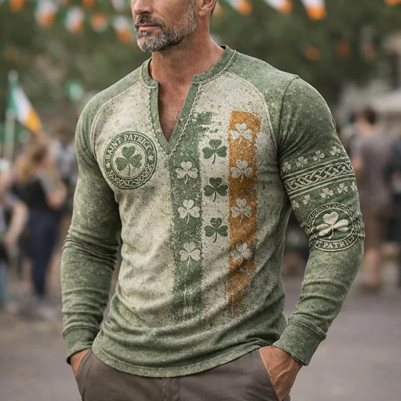 Men's Vintage St. Patrick's Day Print Henley Neck Shirt