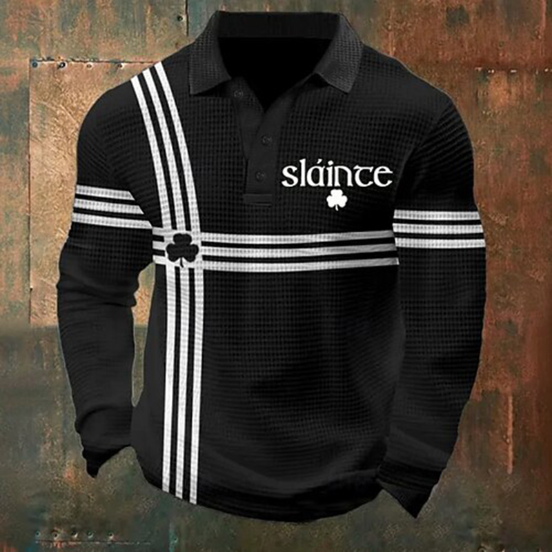 Men's Retro St Patrick's Day Shamrock Print Waffle Long Sleeve Polo Shirt