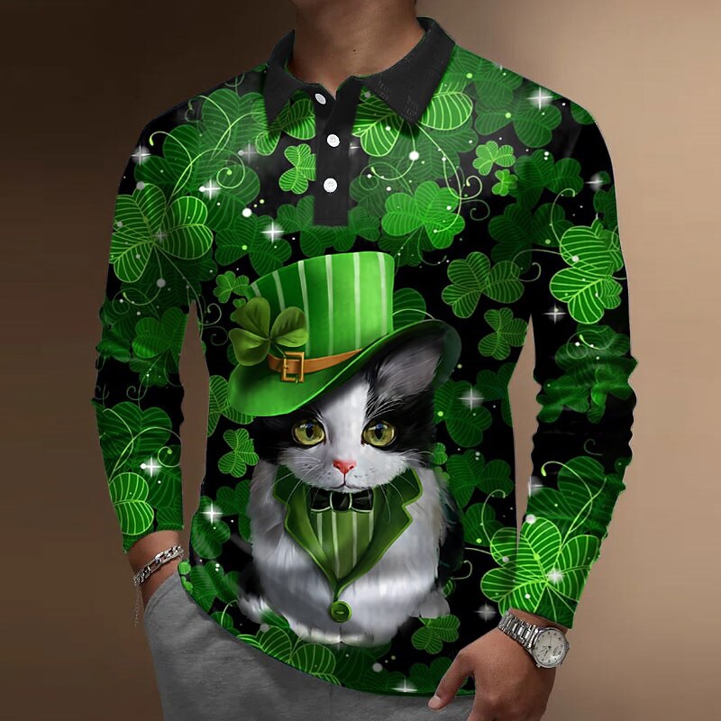 Men's Cat Saint Patrick Day Long Sleeve Polo Shirt
