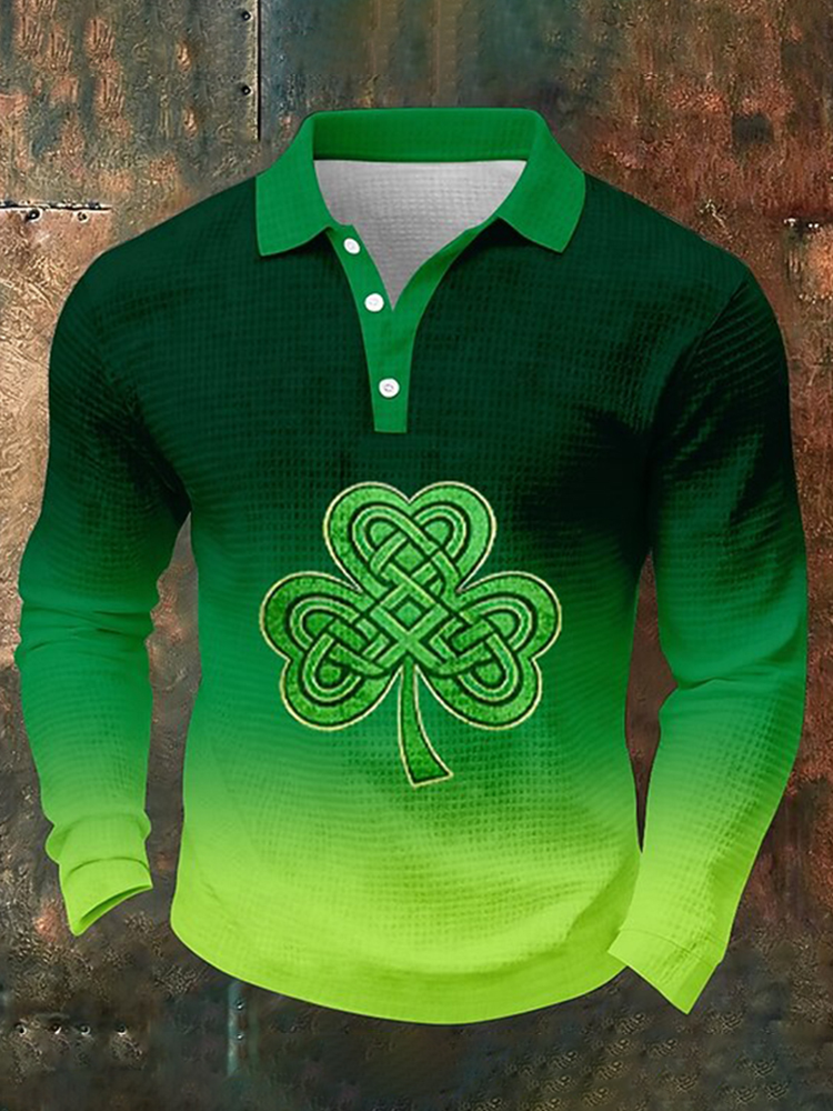 Men's St Patrick's Day Shamrock Print Waffle Long Sleeve Polo Shirt