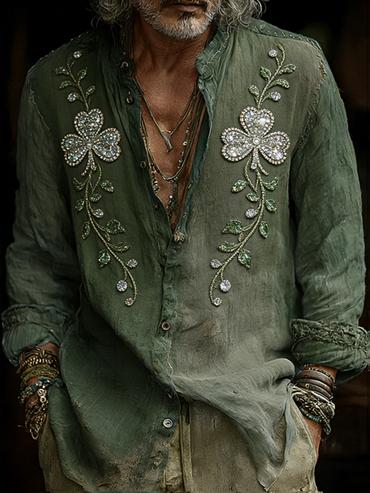 Men's Retro Shamrock Gold Coin Print Button Up Shirt