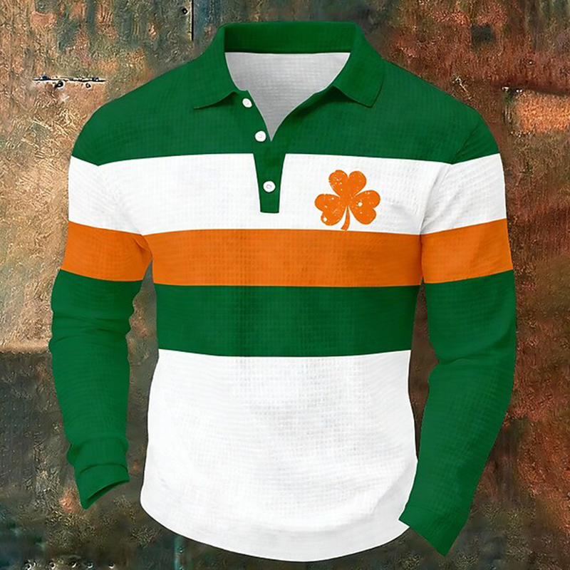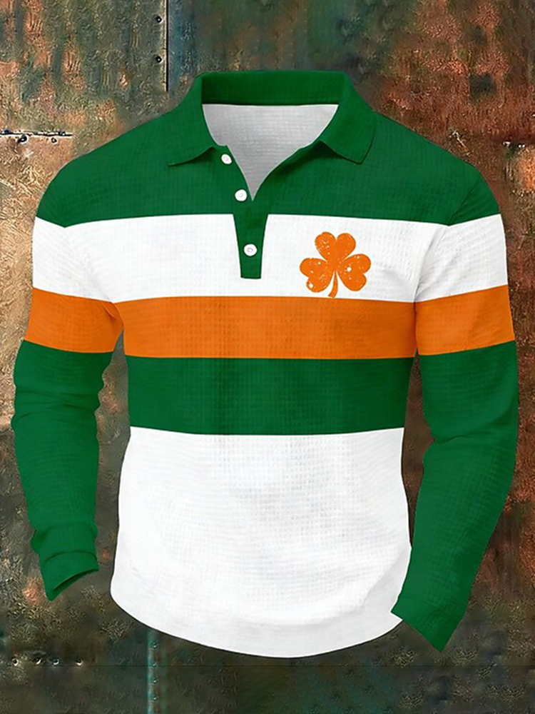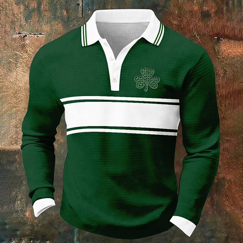 Men's Casual St Patrick's Day Shamrock Print Waffle Long Sleeve Polo Shirt