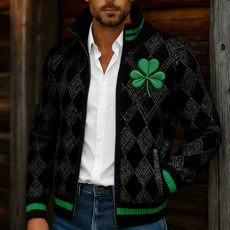 Men's St Patrick's Day Shamrock With Diamond Pattern Art Cozy Knitted Gentleman Full Zip Cardigan
