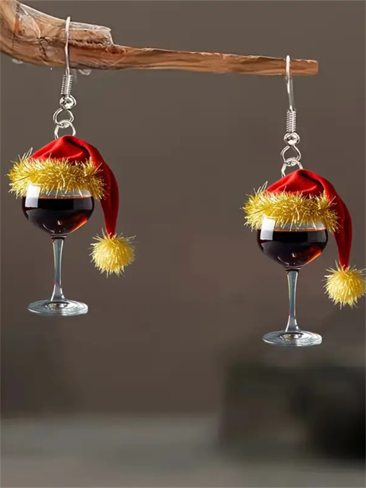 Christmas Wine Glass With Hat Funny Earrings