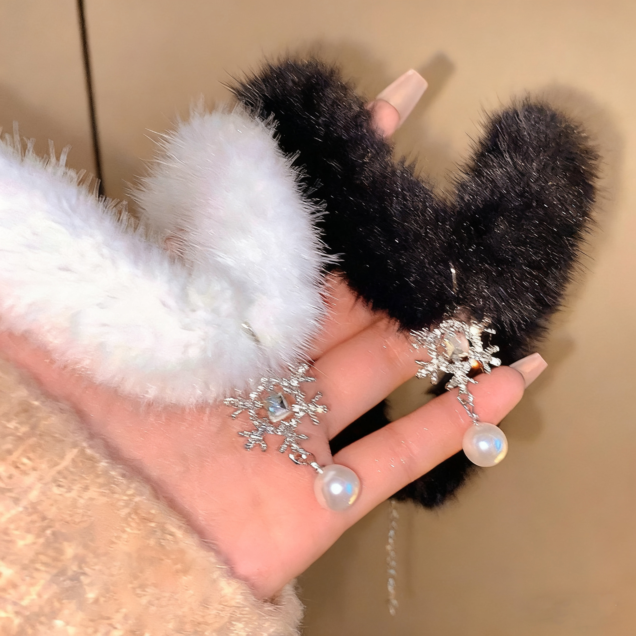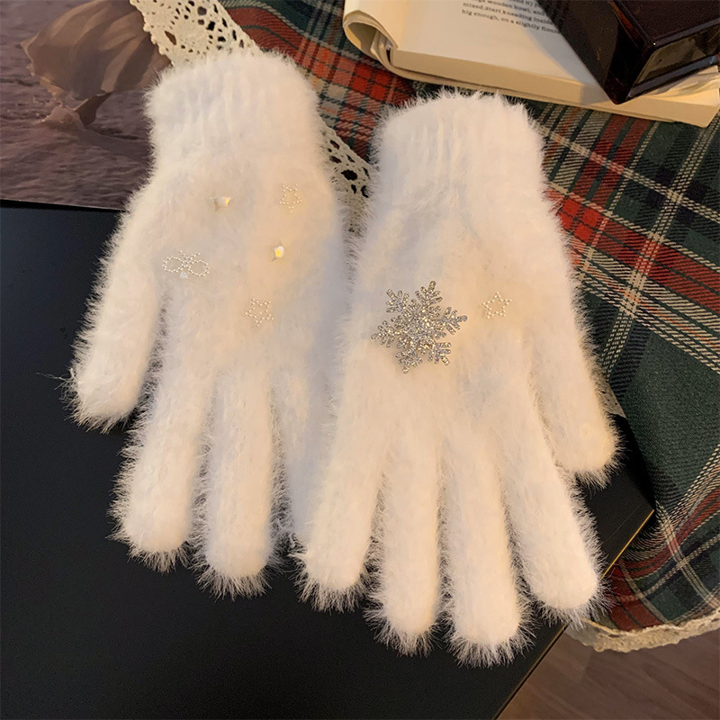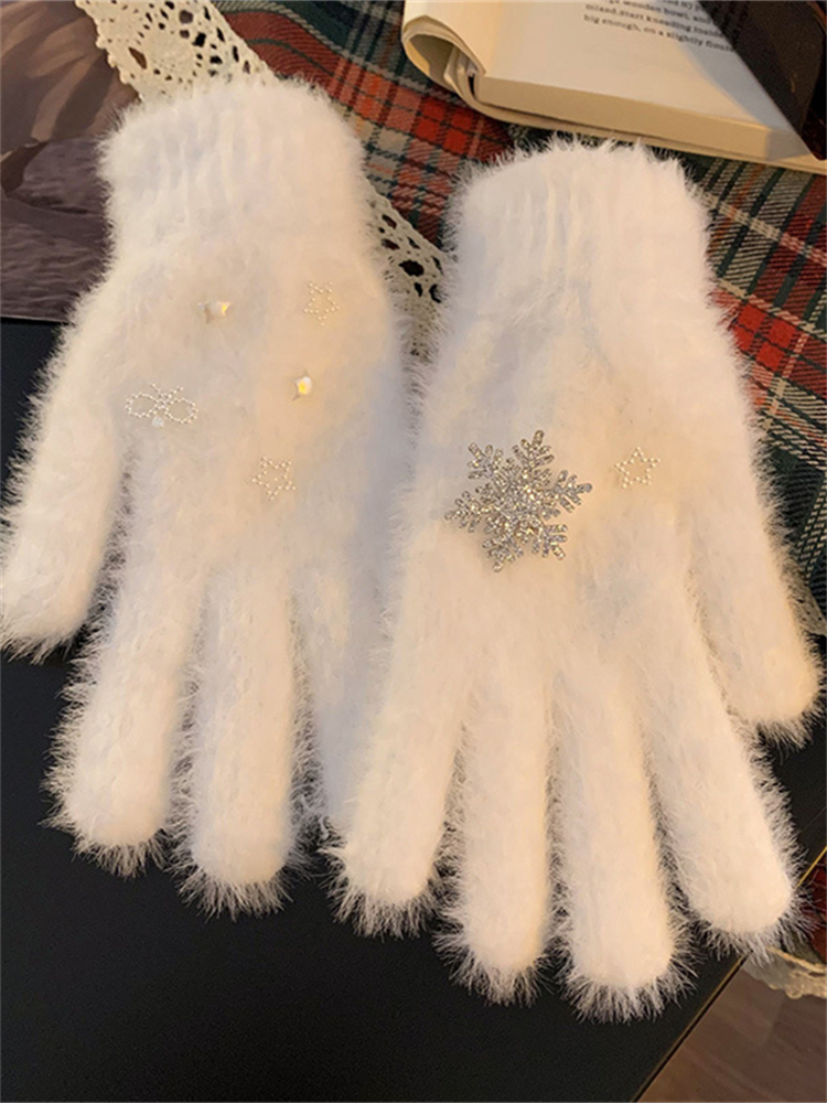 Classy Snowflake Pearls Beaded Fuzzy Cozy Gloves