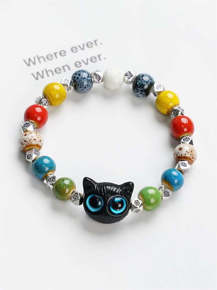 Lovely Black Cat Colorful Ceramic Beaded Bracelet