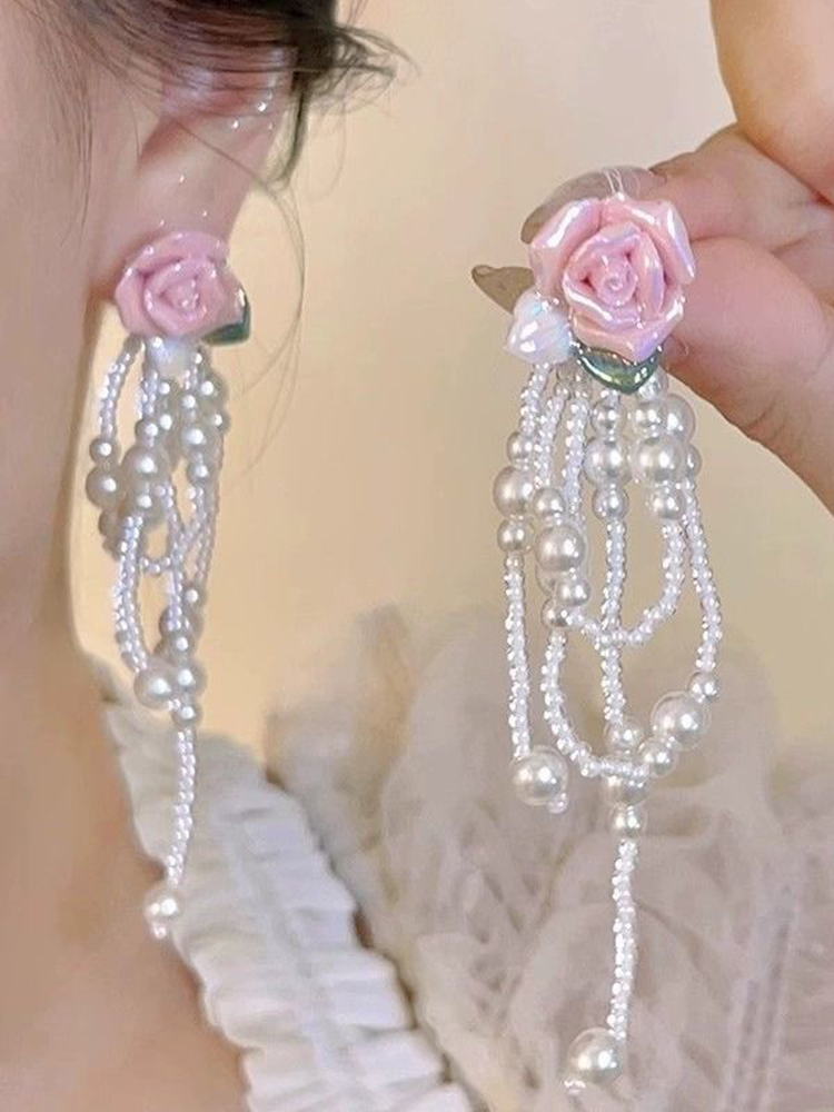 Vintage Alloy Pearl Rose Tassel Earrings