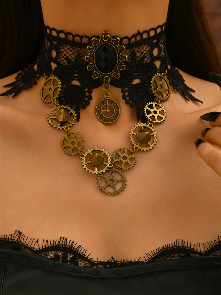 Vintage Gothic Steampunk Gear Black Lace Choker