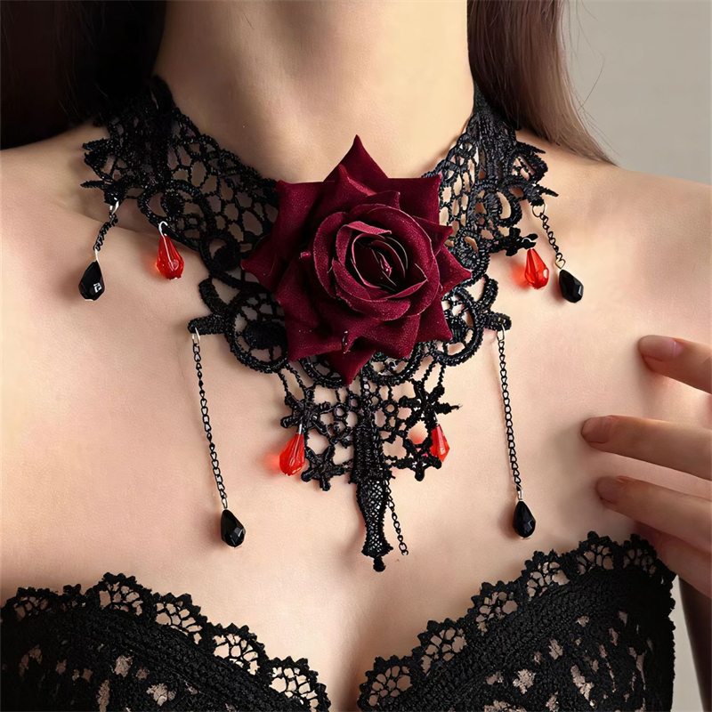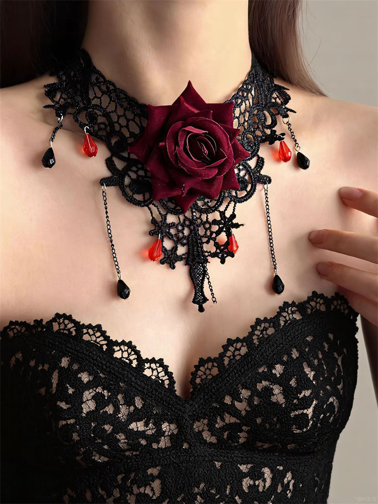 Vintage Gothic Scarlet Rose Diamond Black Lace Choker