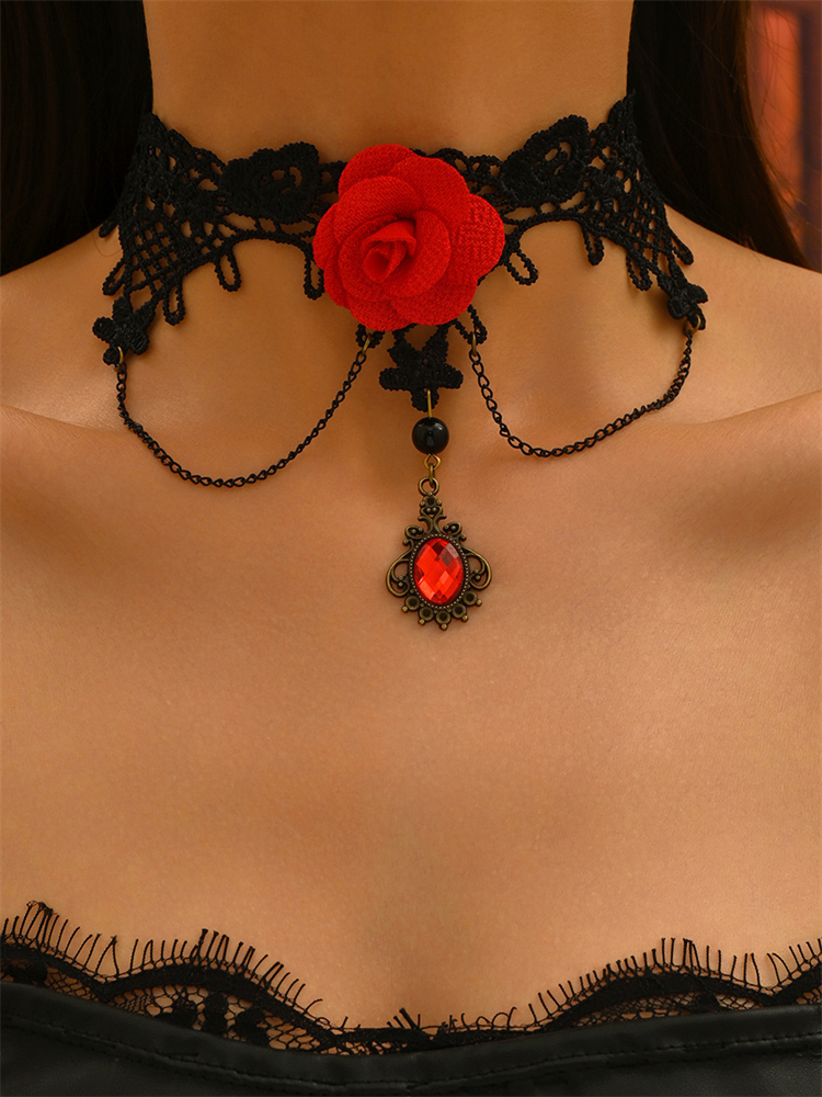 Vintage Gothic Red Rose Diamond Black Lace Choker