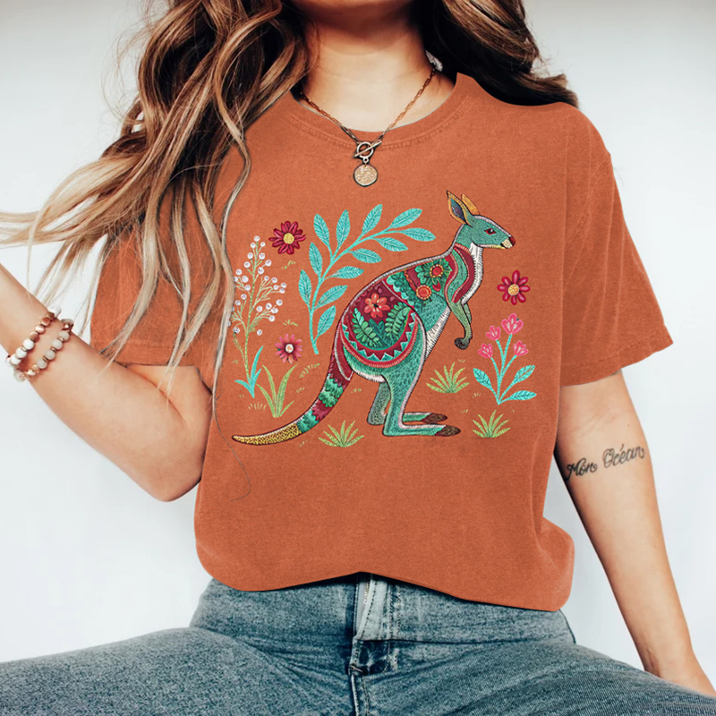 Women's Australian Kangaroo Floral Art Print Short Sleeve Casual T-shirt