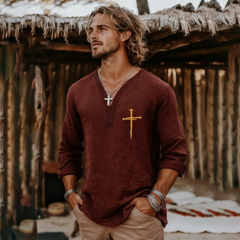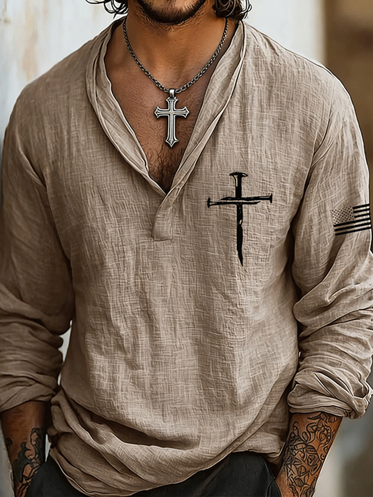 Men's Vintage Faith Cross Art Loose And Comfortable Cotton And Linen Long-sleeved V Neck Shirt