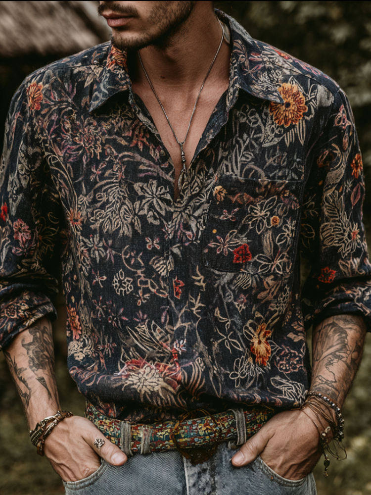 Bohemian Style Plant And Flower Pattern Men's Retro Cotton And Linen Shirt