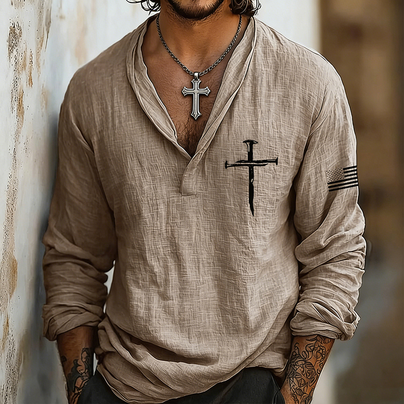 Men's Vintage Faith Cross Art Loose And Comfortable Cotton And Linen Long-sleeved Shirt