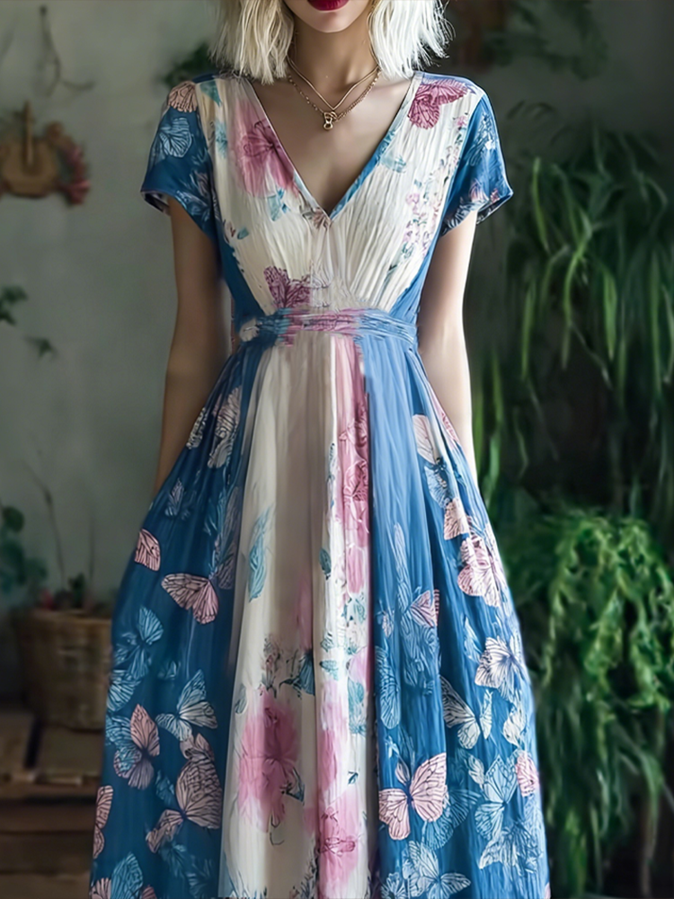 Retro Butterfly Print Transgender Colorblock Patchwork Dress
