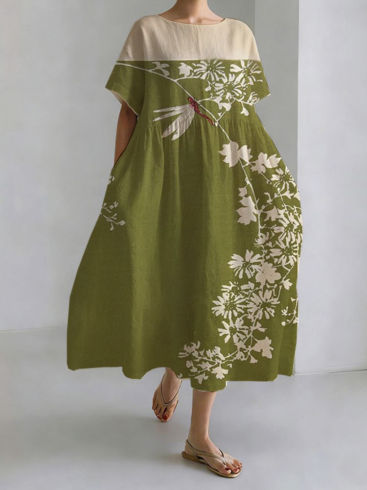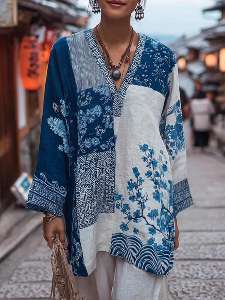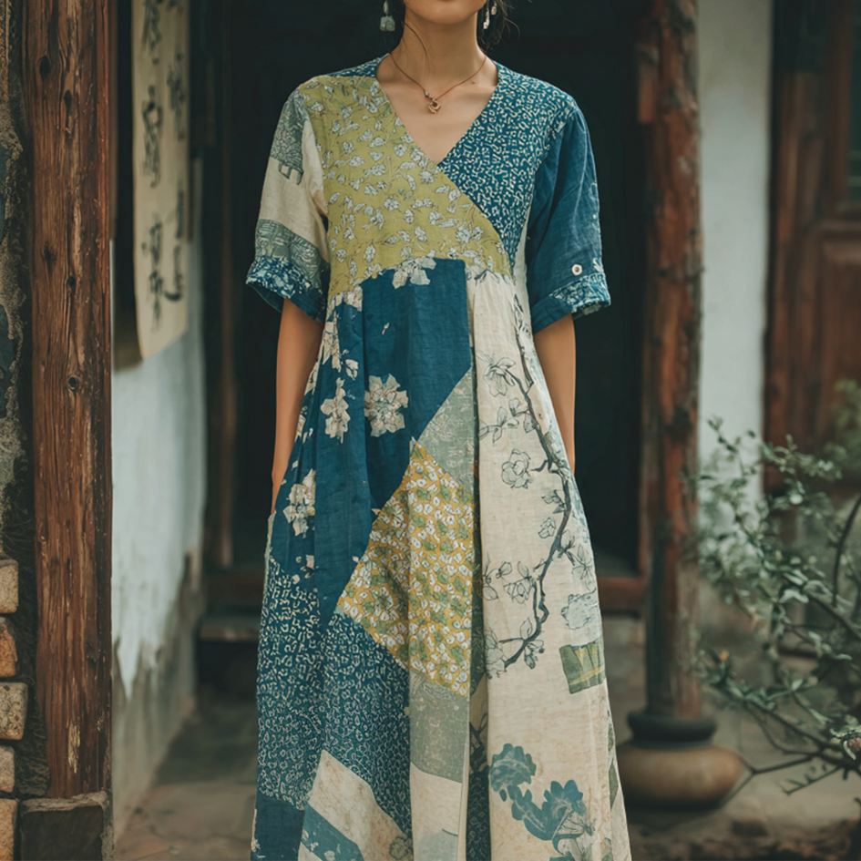 Japanese Art Retro Geometric Patchwork Plant Flower Print Women's V-neck Cotton And Linen Dress