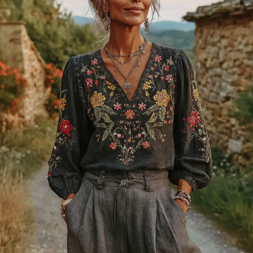 Bohemian Retro Countryside Style Plant Flower Design Cotton And Linen Women's Long-sleeve Shirt1