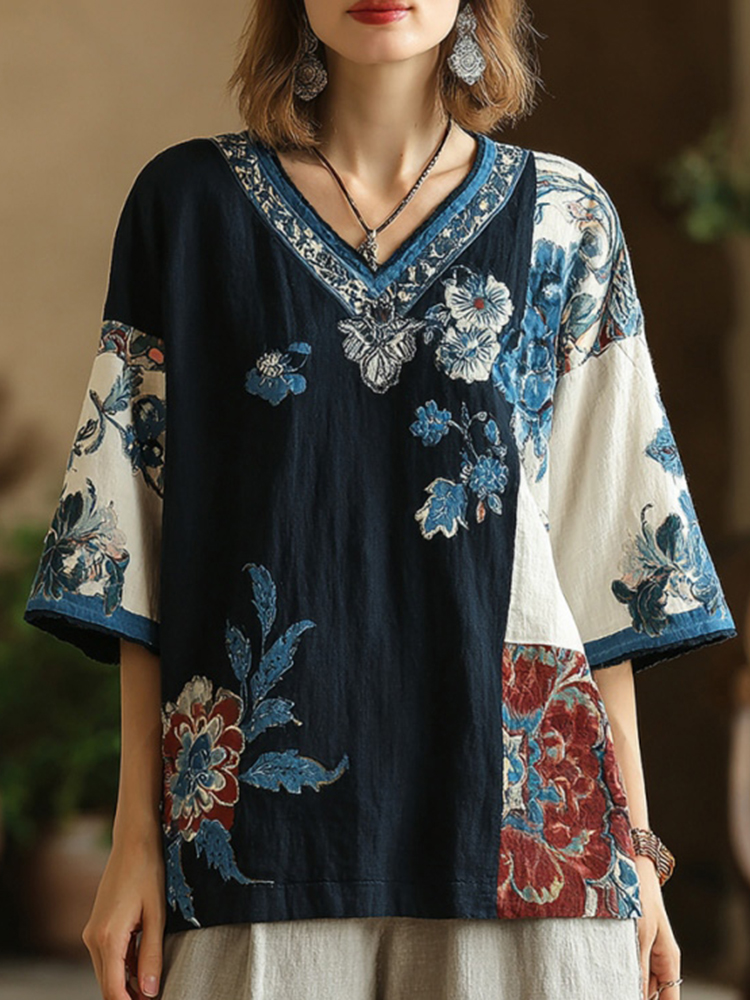 Women's Floral Pattern Color Block Linen V-neck T-shirt