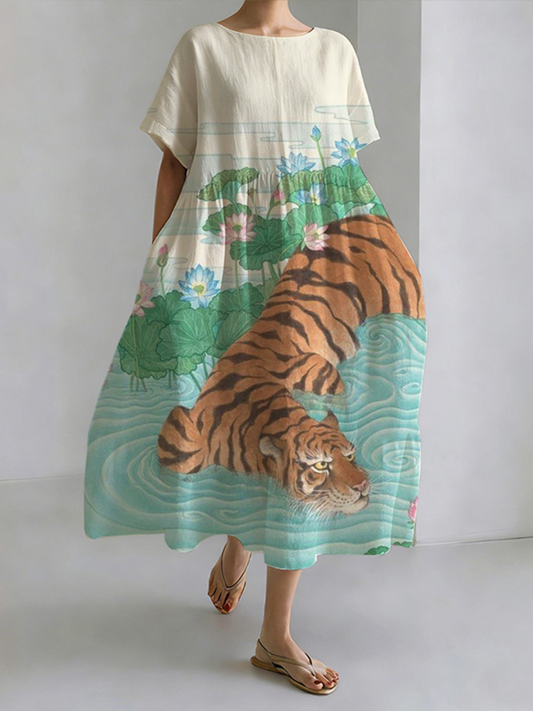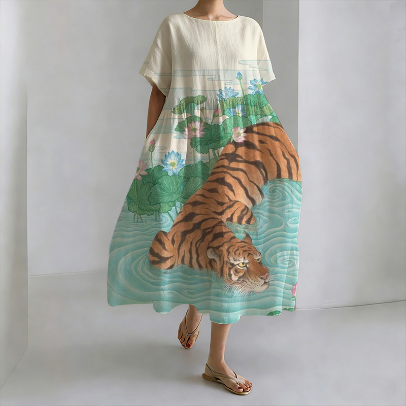 Lotus Pond Tiger Print Round Neck Casual Dress
