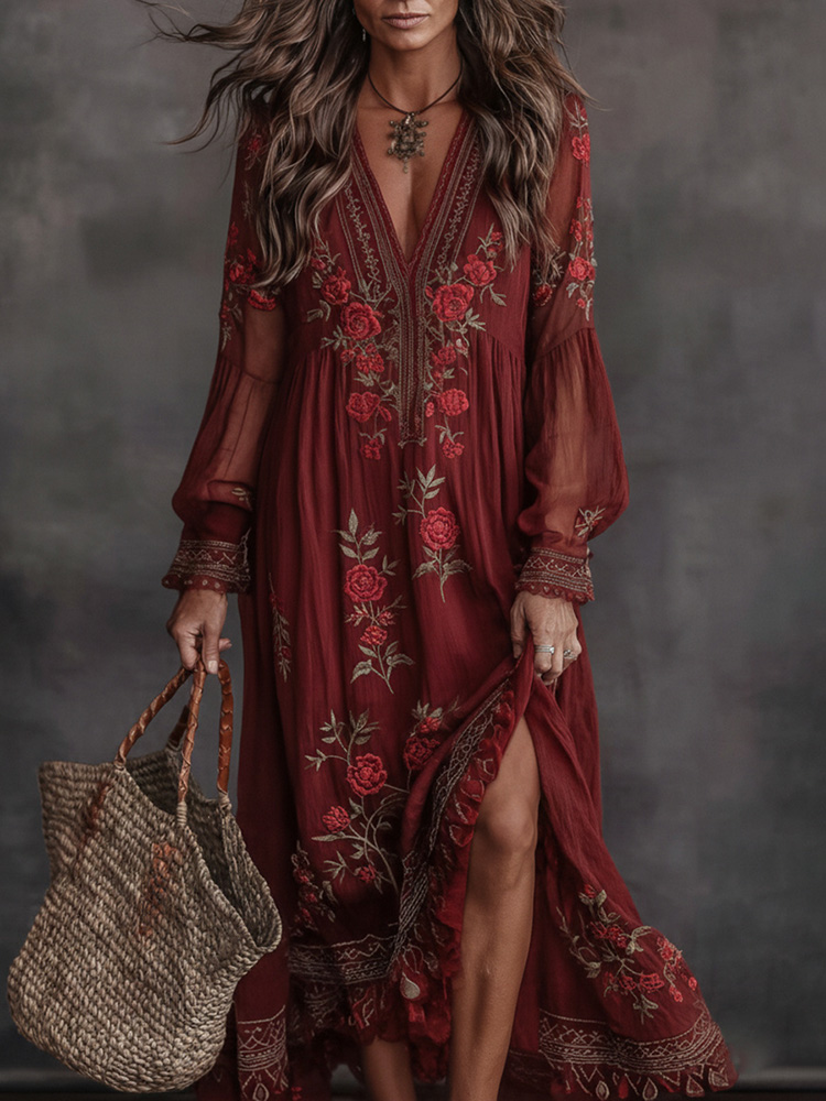 Women's Bohemian Style Rose Long-sleeved V-neck Dress