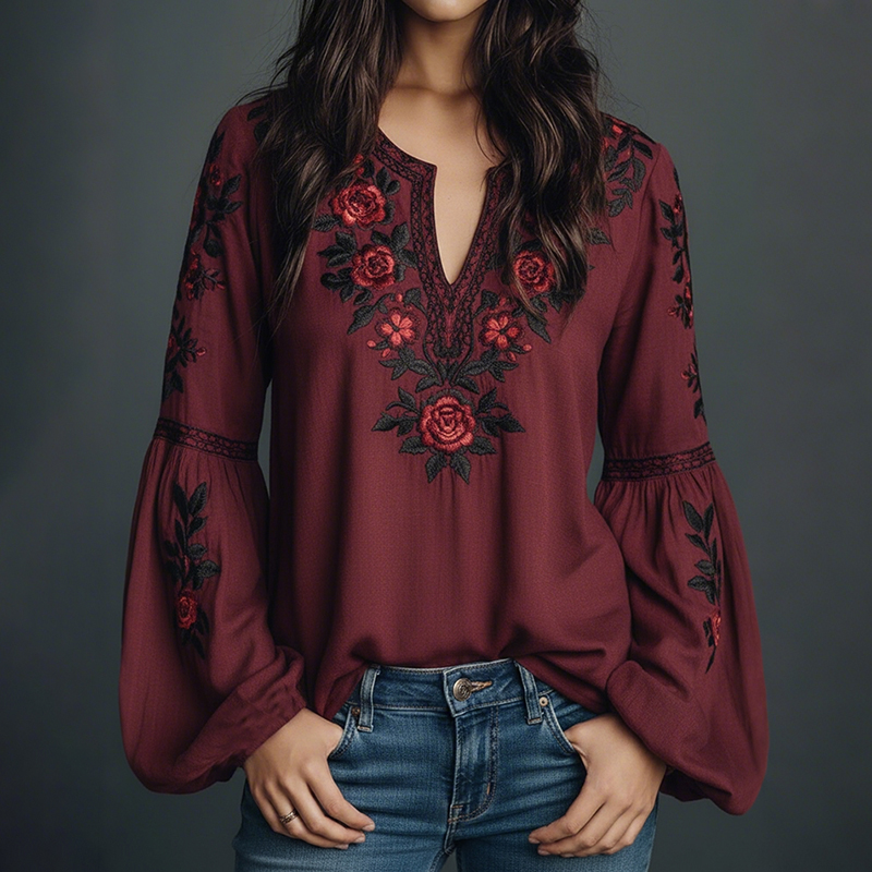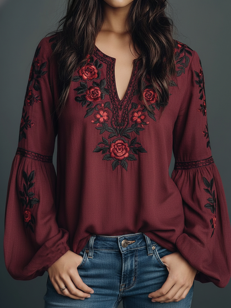 Women's Retro Floral Embroidered Art Print Flowy Linen Blend Casual Tops