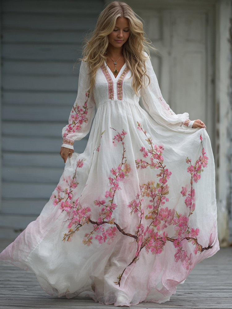 Women's Boho Style Rose Art Long-sleeved V-neck Dress