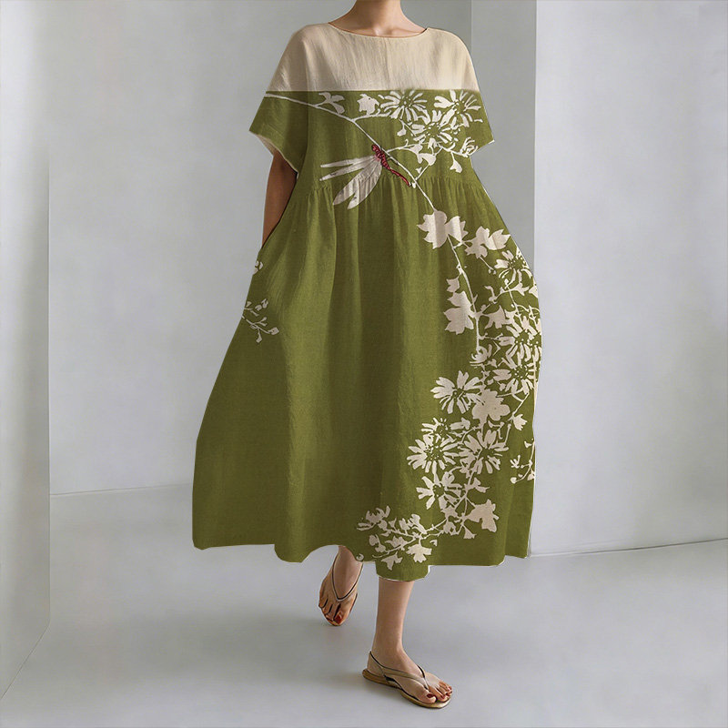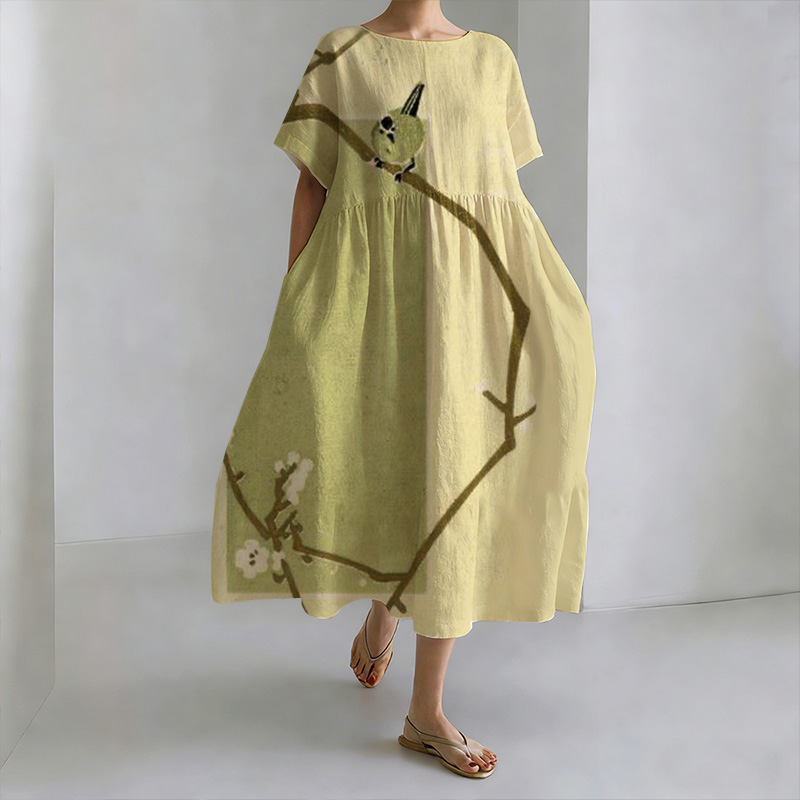 Japanese Art Bohemian Retro Plant Flower Print Women's Half-length Dress