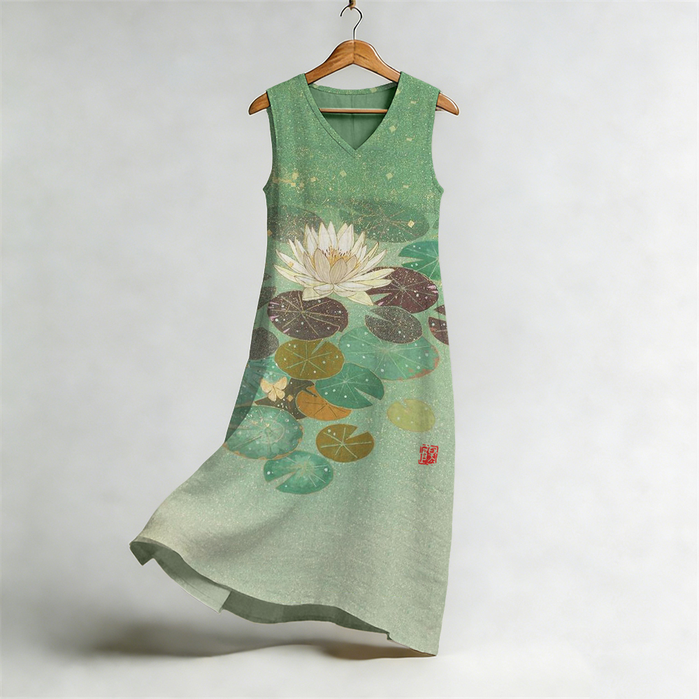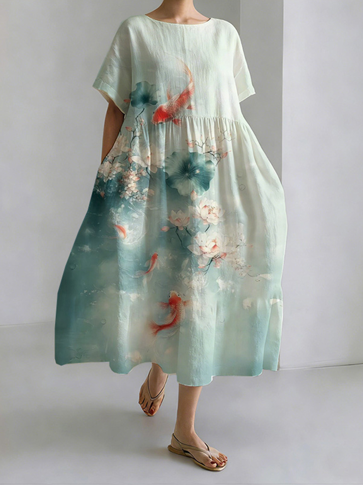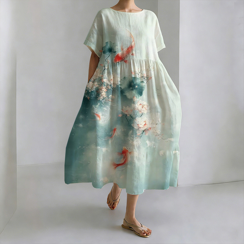 Japanese Style Koi And Lotus Pond Round Neck Casual Dress