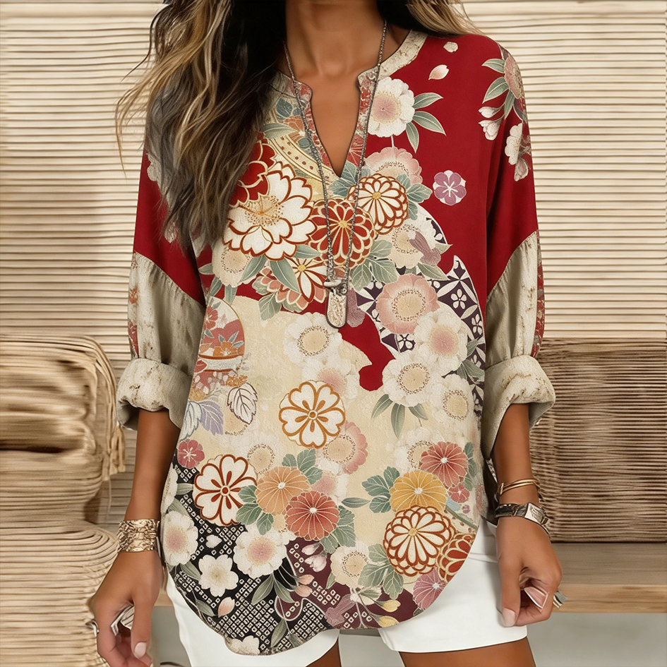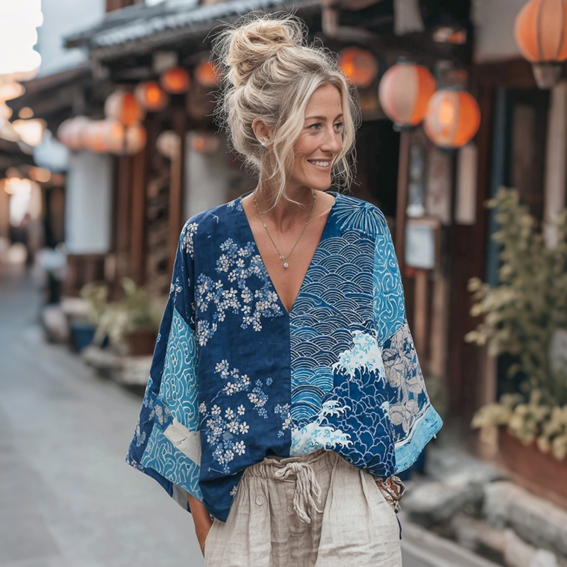 Japanese Art Retro Plant Flower Printed Women's Top