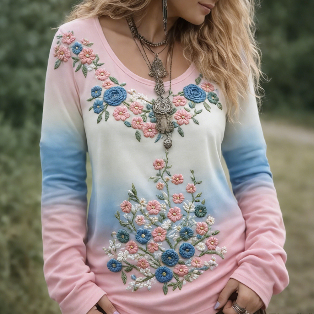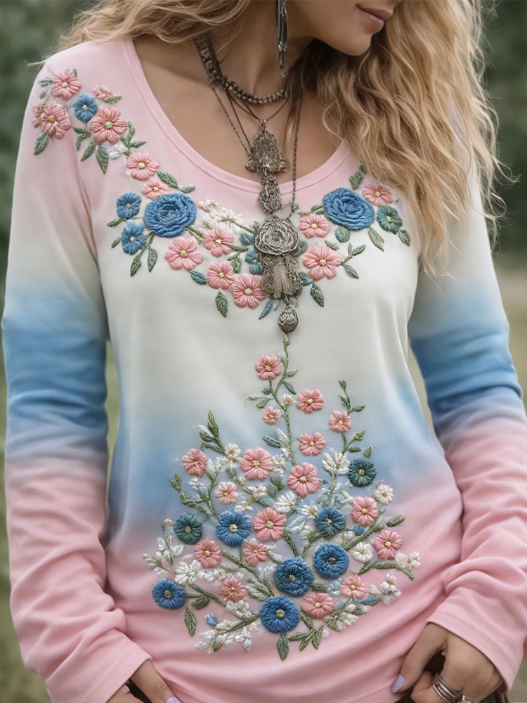 Women's Floral Embroidered Round Neck Comfortable Top