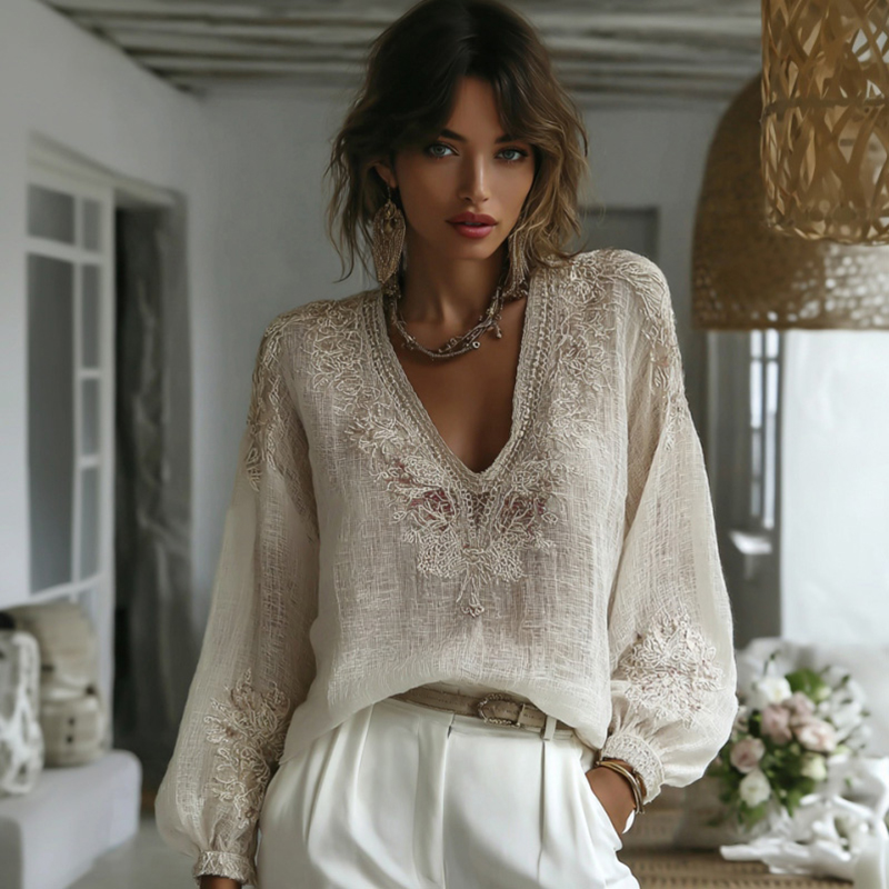 Bohème Rose Linen V-neck Relaxed Top