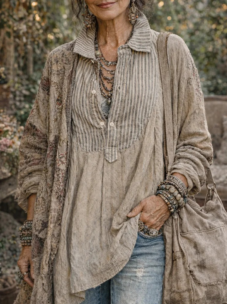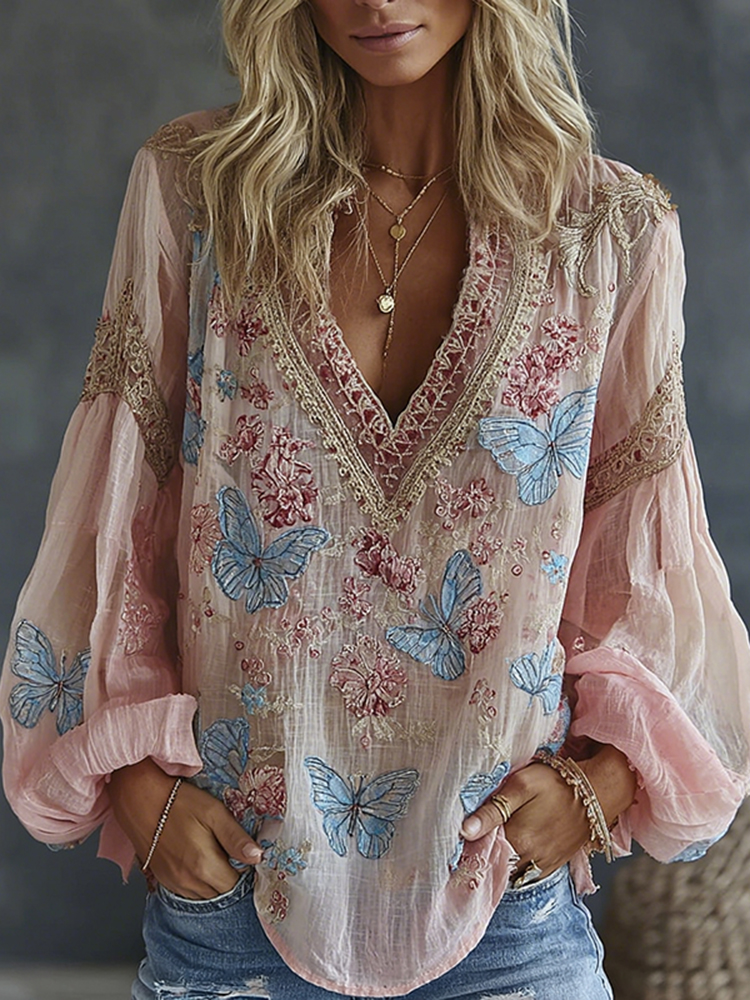 Bohemian Style Linen Vintage Floral Art Print Long Sleeve Shirt