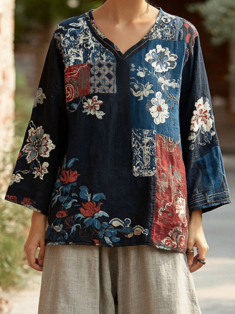 Retro Ethnic Floral Patchwork Print Pattern Women's Top