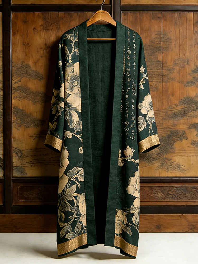 Japanese Art Retro Plants And Flowers Printed Long Cardigan