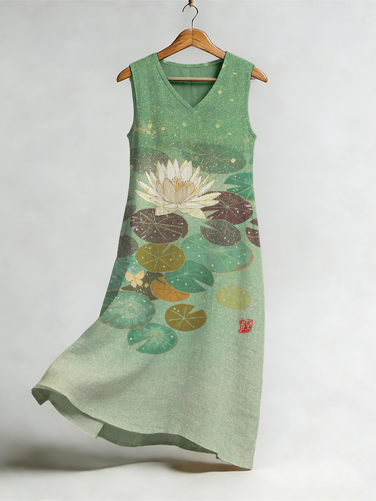 Lotus Flower Japanese Art Flowy Linen Midi Dress