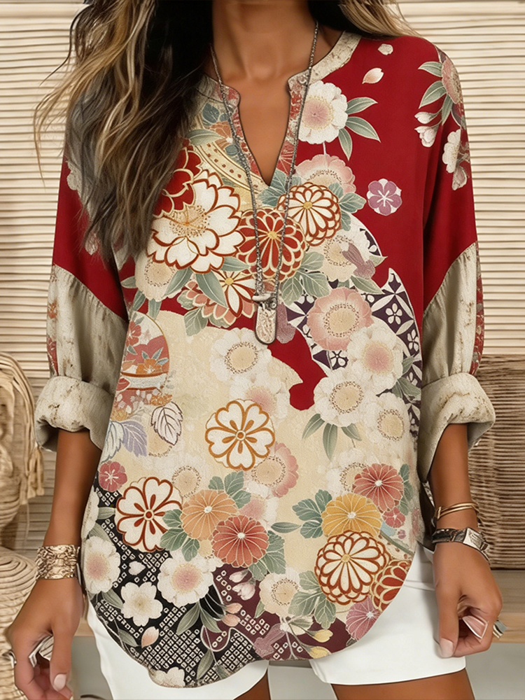 Women's Retro Floral Pattern Color Block Top