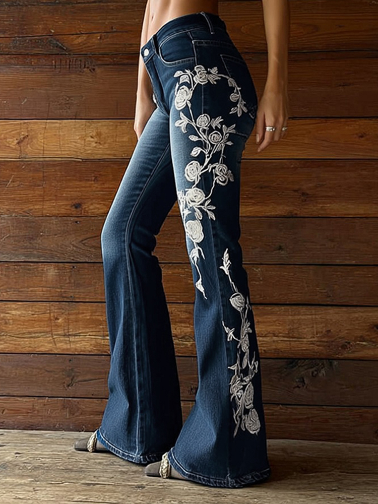 Vintage Bohemian Rose Embroidered Washed Flared Jeans