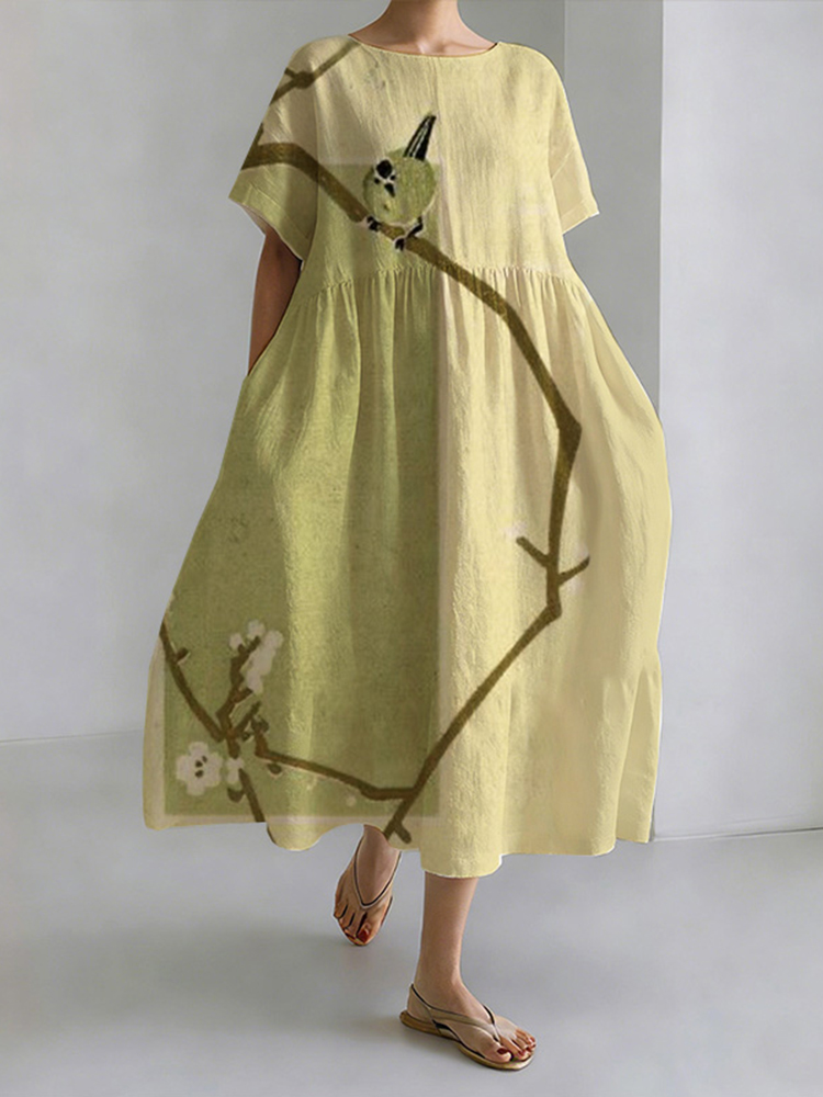 Vintage Japanese Plum Blossom Art Linen Blend Dress