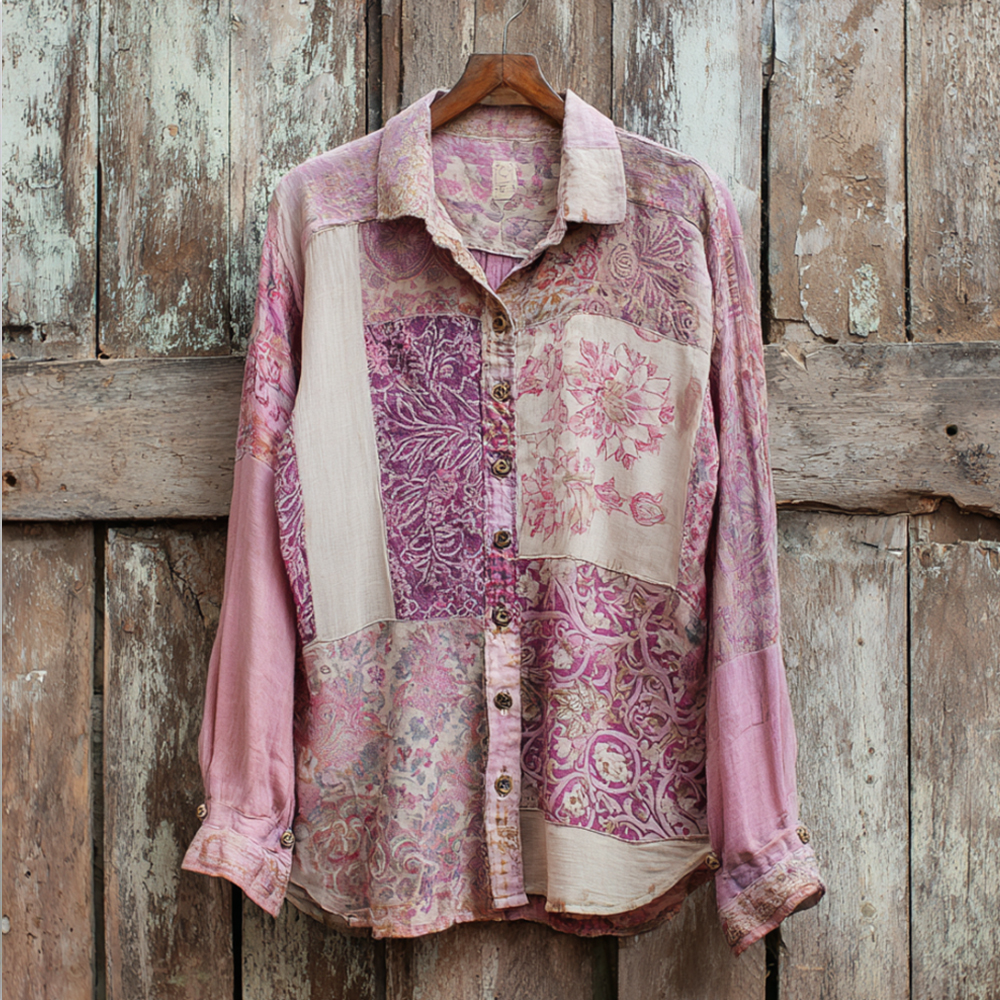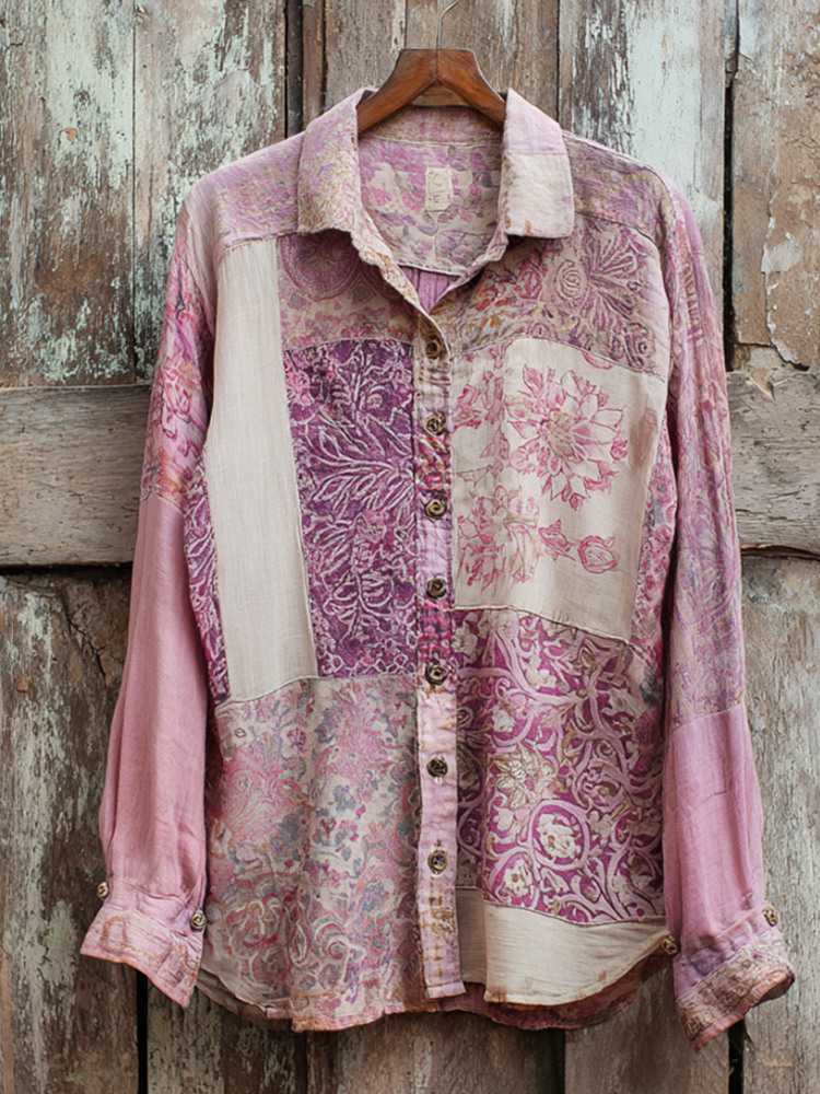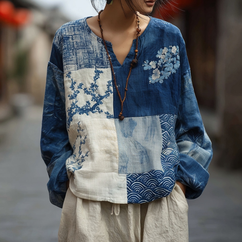 Women's Japanese Traditional Sashiko Floral Patchwork Art V-neck Shirt