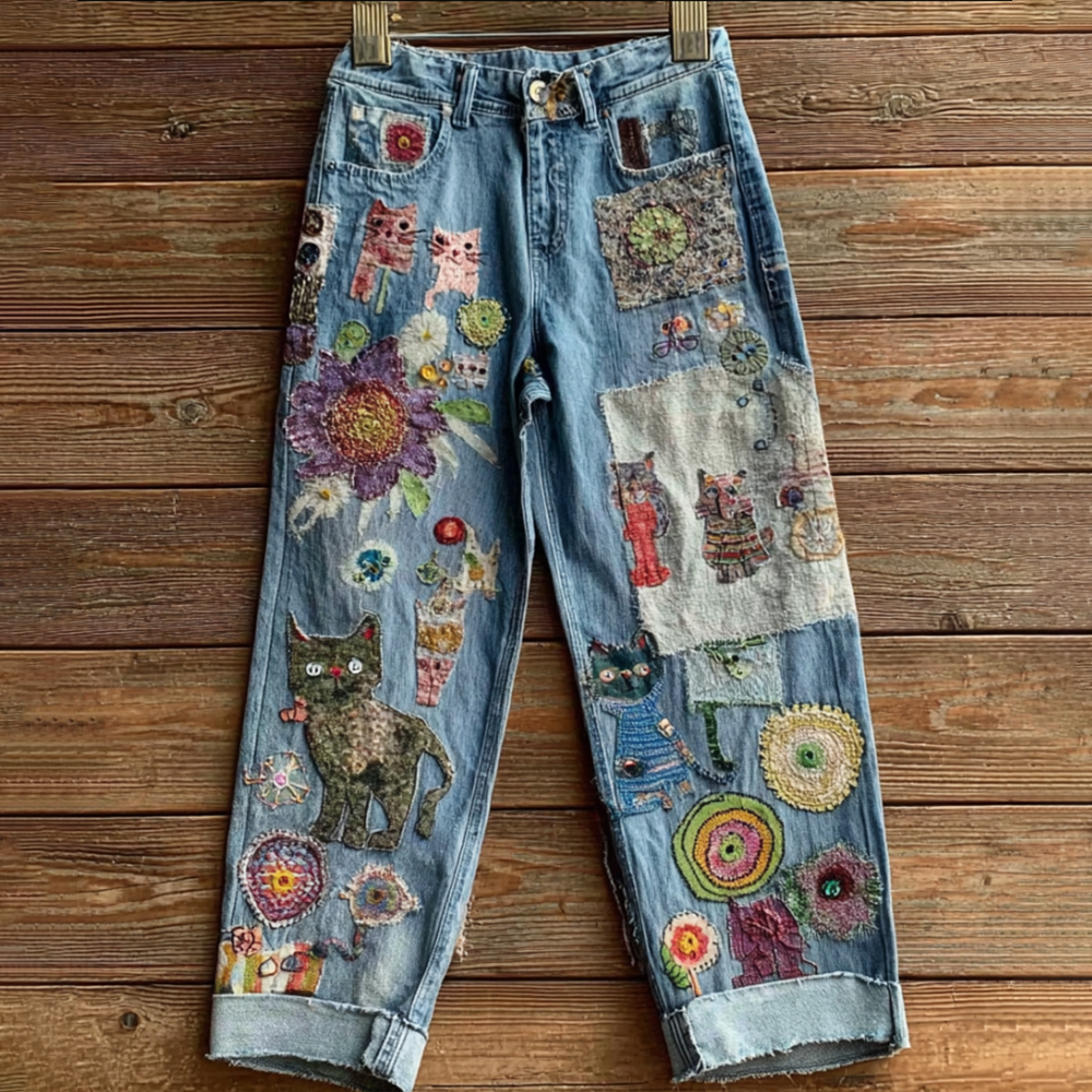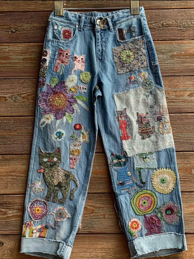 Women's Bohemian-style Floral Cat-print Jeans