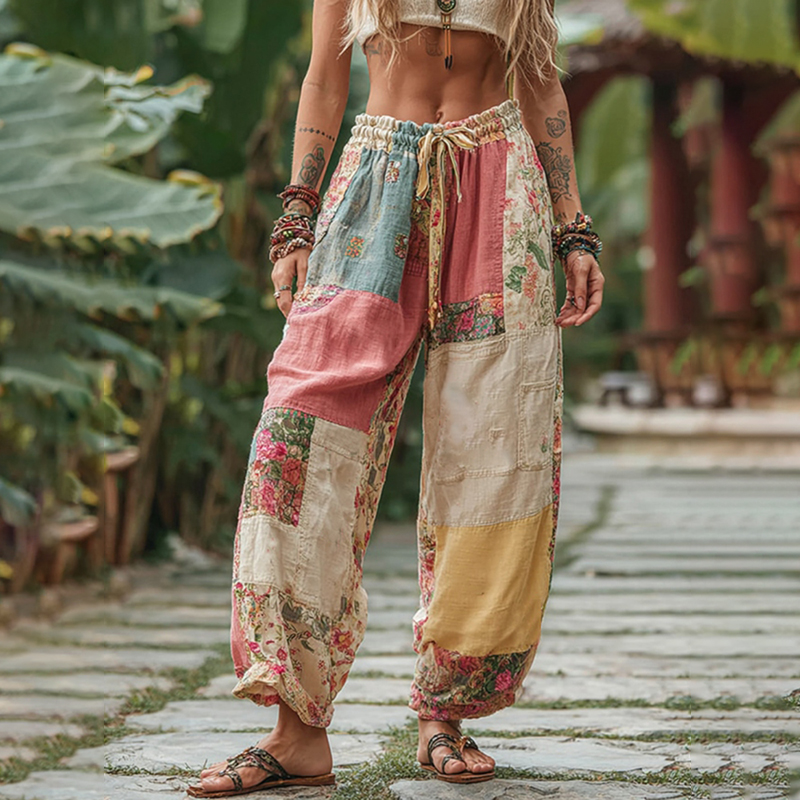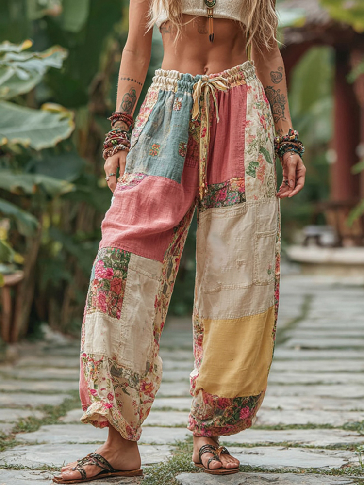 Vintage Boho Floral Patchwork Pattern Women's Linen Trousers