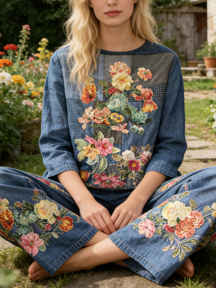 Vintage Retro Floral Patchwork Art Linen Pants