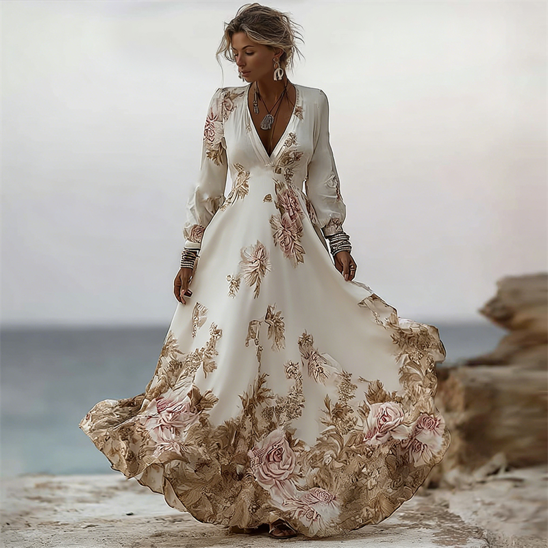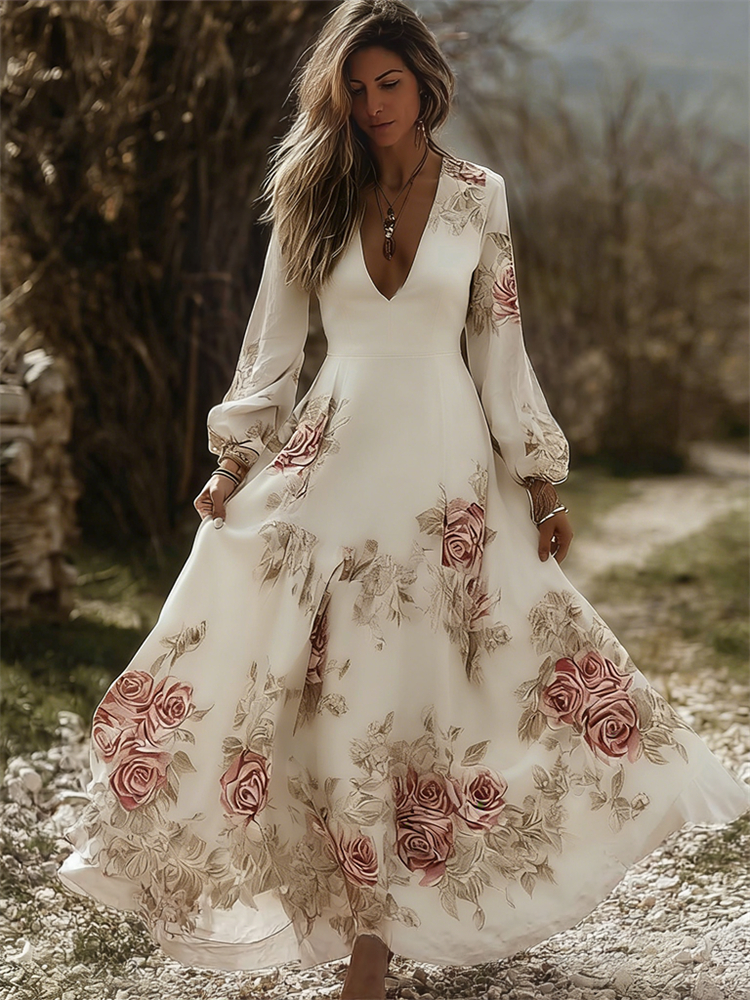 Vintage Boho Roses Print V Neck Long Sleeve Flowy Maxi Dress