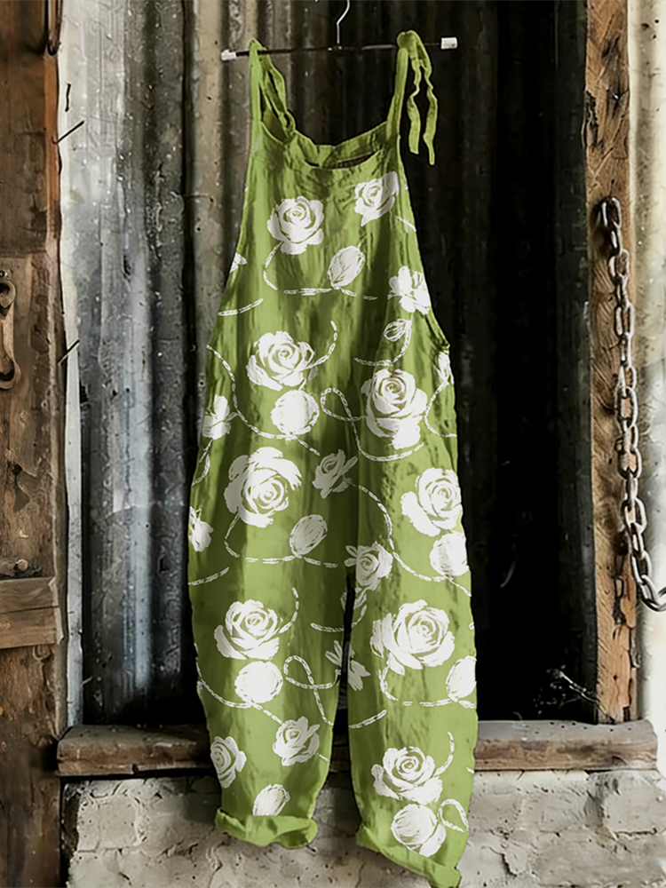 Vintage Retro Rose And Floral Patchwork Art Linen Pants