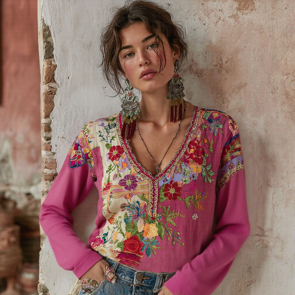 Women's Bohemian Patchwork Art Floral V-neck Linen Long Sleeve Top