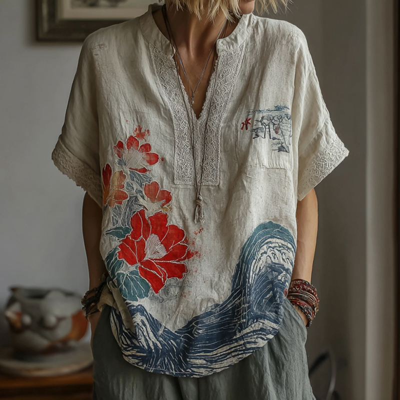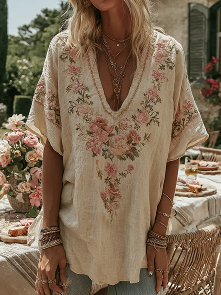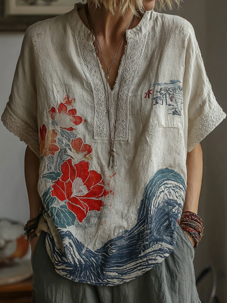 Western-style Plant And Flower Elements Casual V-neck Linen Short-sleeved Shirt
