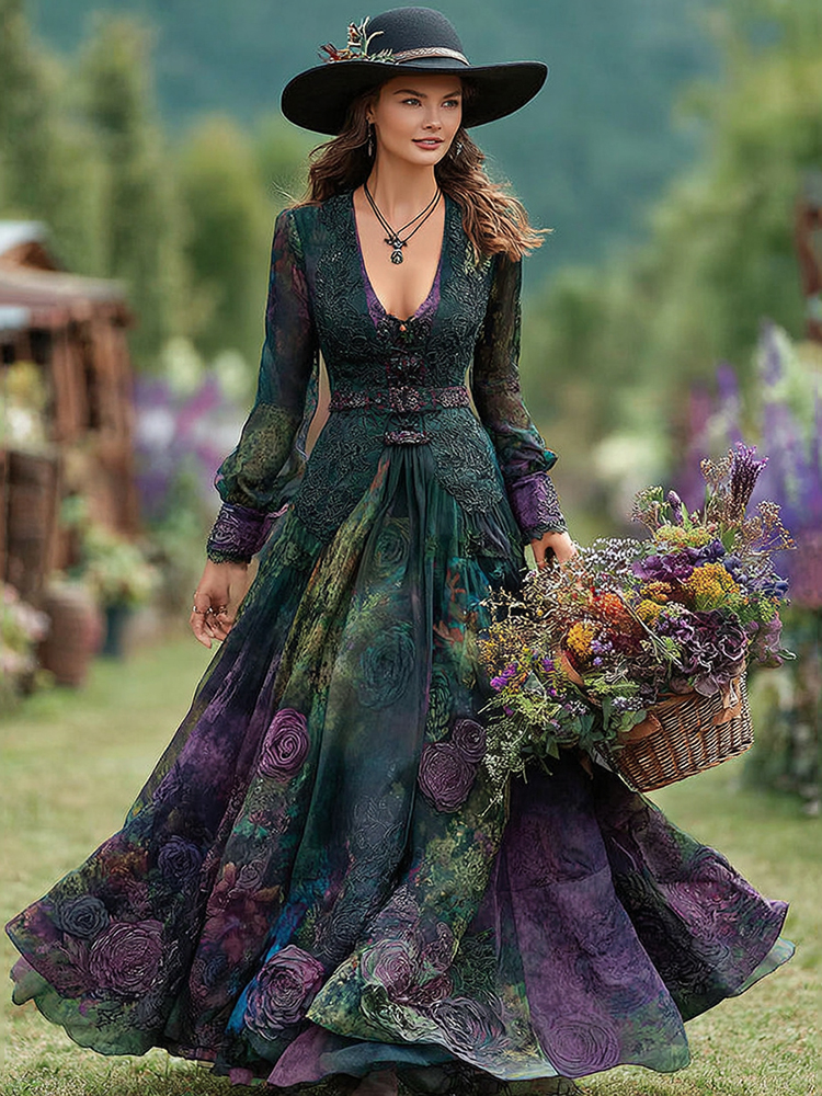 Vintage Purple Floral Lace Art V Neck Long Sleeve Maxi Dress